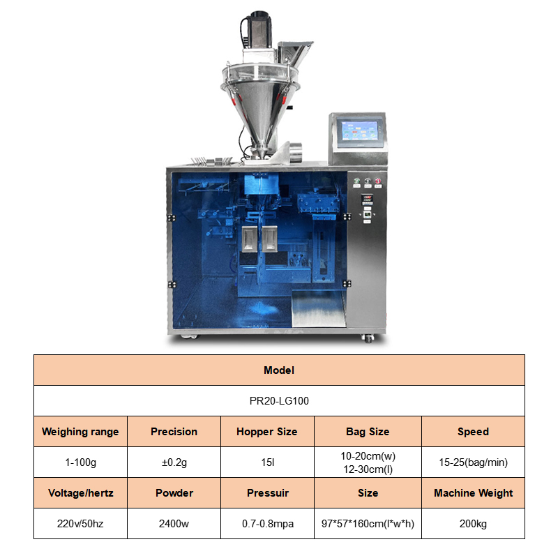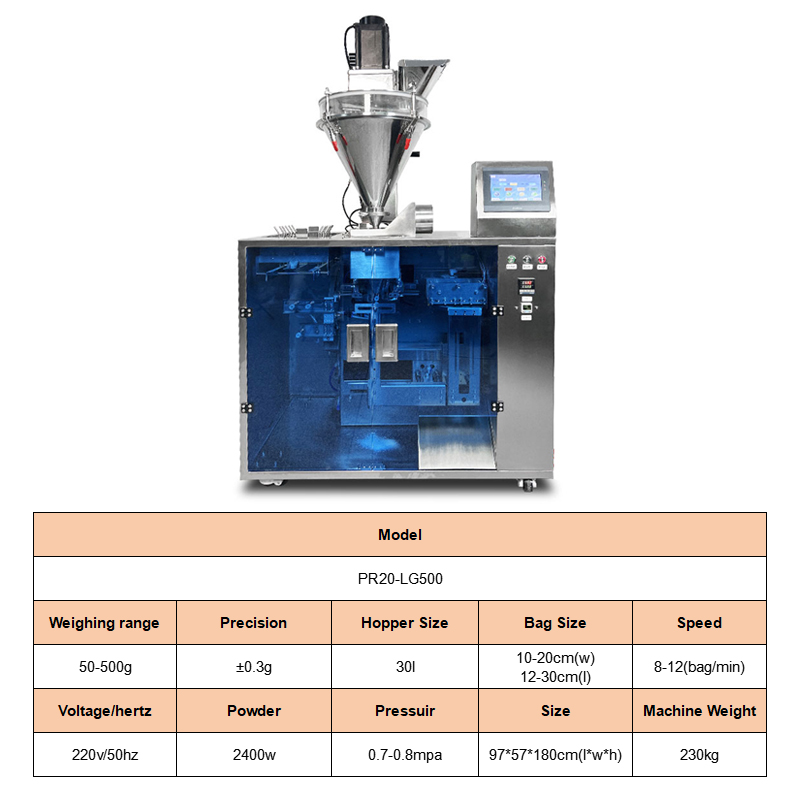 JD produces 300g screw powder feeding bag packing machine, which is suitable for quantification, weighing, packaging, filling and sealing of powder products such as coffee powder, seasoning powder, curry powder, pepper powder, chili powder, unrefined, chicken essence, salt, sugar and so on.