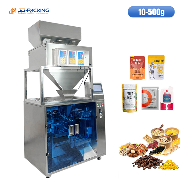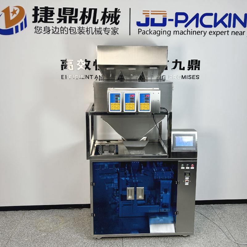 JD produces 3 heads 500g pneumatic particle feeding bag packing machine, which is suitable for rice and millet, cereals, vegetable seeds, cat and dog food, fertilizer feed, nuts and seeds, corn seeds, coffee beans, screws and nuts, hardware accessories, plastic products, electronic raw devices and other particle products quantitative, weighing, filling, sealing