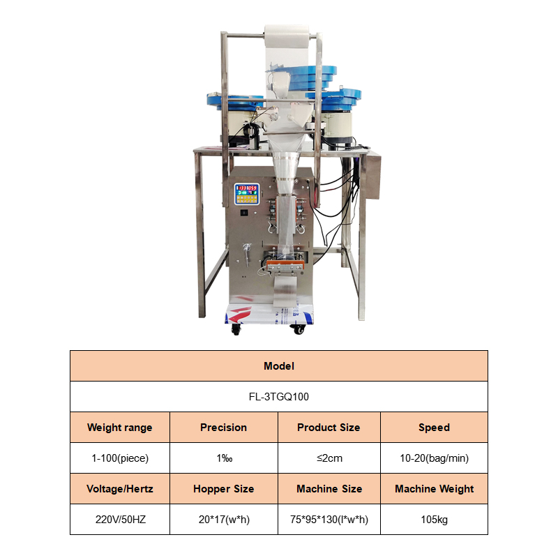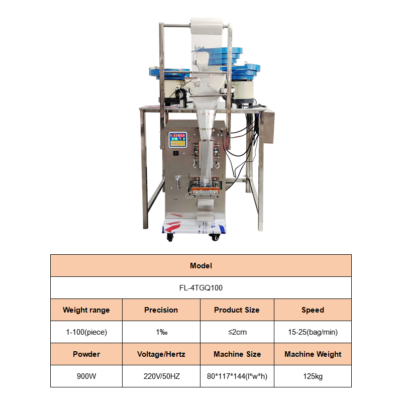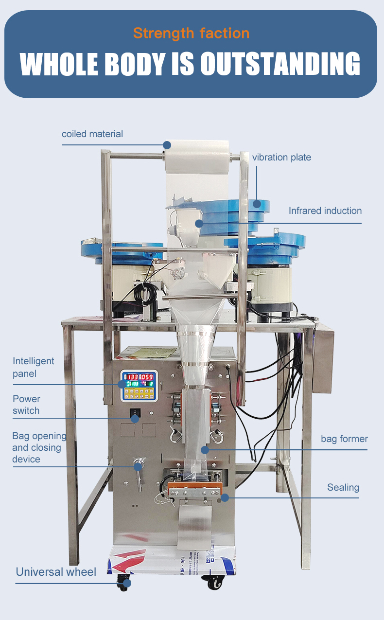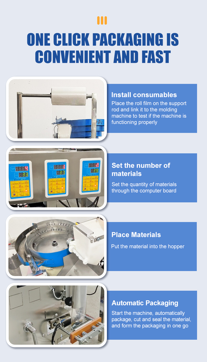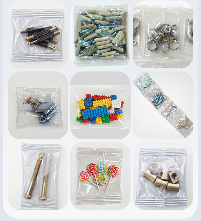The multi head counting packaging machine is suitable for counting, packaging, bag making, and packaging of solid products with regular shapes. It is suitable for tablets, capsules, hardware (screws, nuts), electronic components (resistors, capacitors), toy parts, and other products. Accurate counting, fast packaging speed