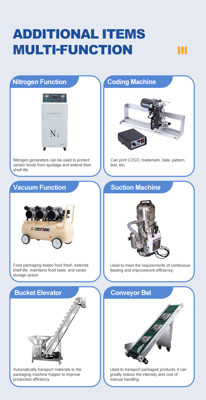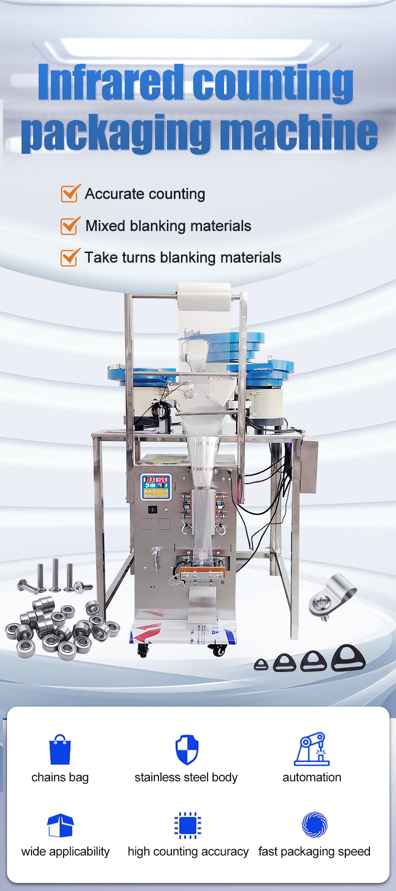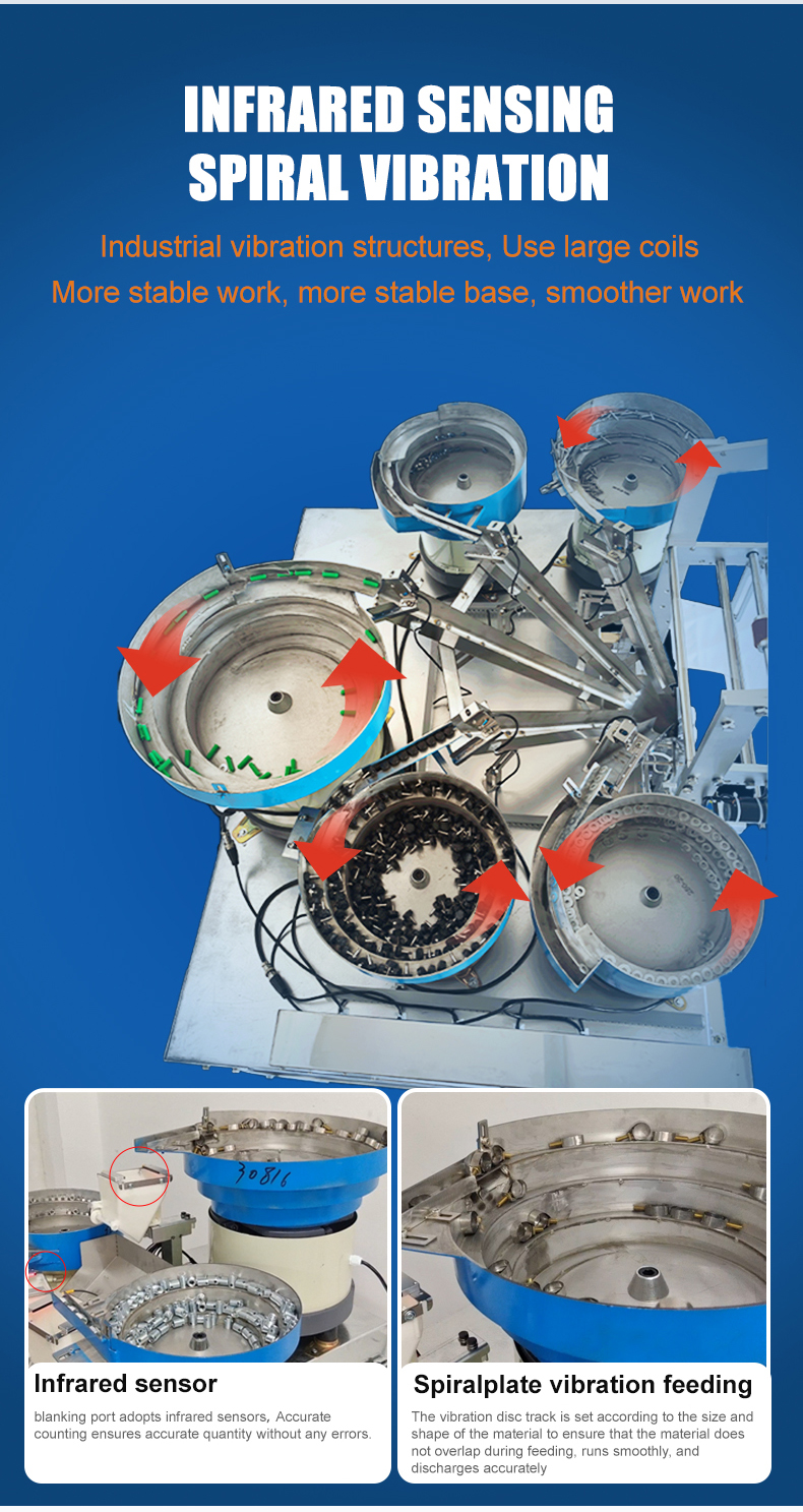 The multi head counting packaging machine is suitable for counting, packaging, bag making, and packaging of solid products with regular shapes. It is suitable for tablets, capsules, hardware (screws, nuts), electronic components (resistors, capacitors), toy parts, and other products. Accurate counting, fast packaging speed
