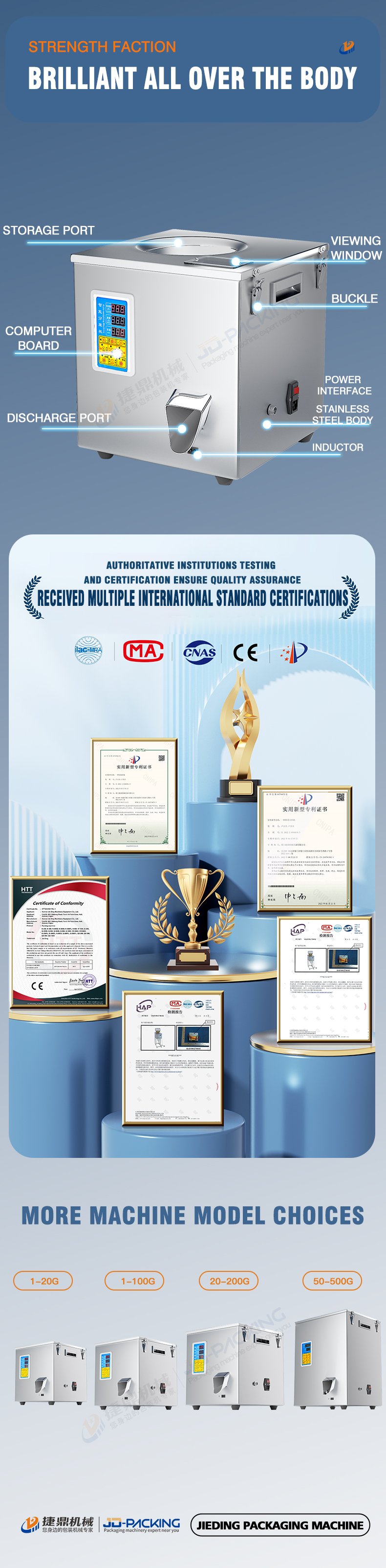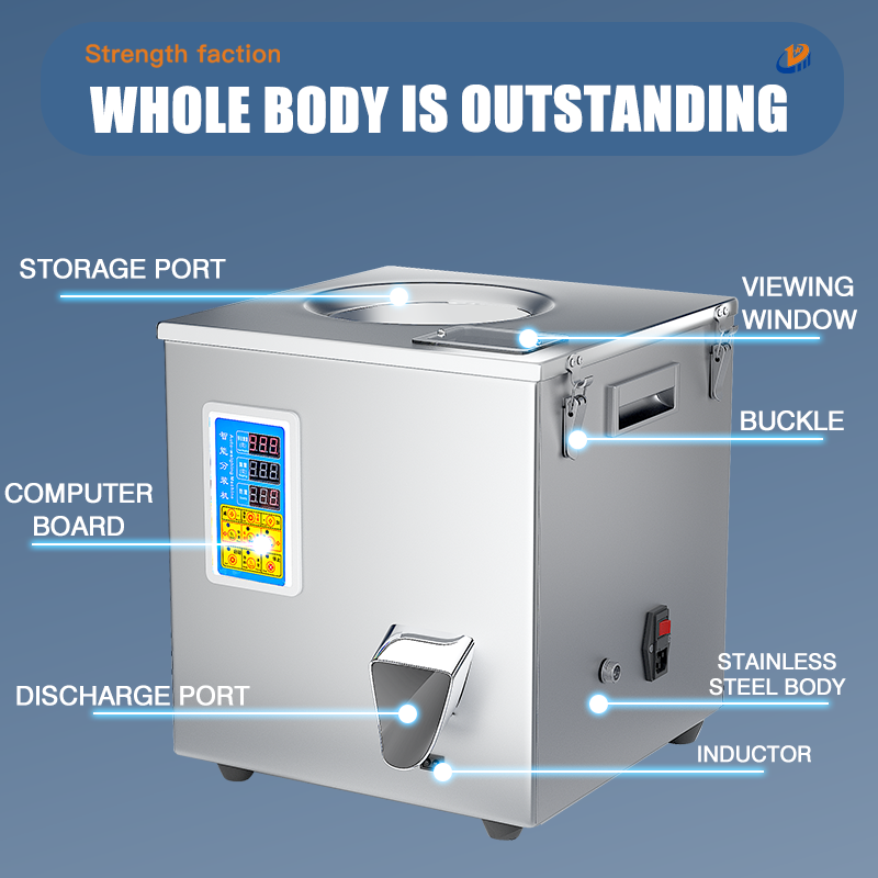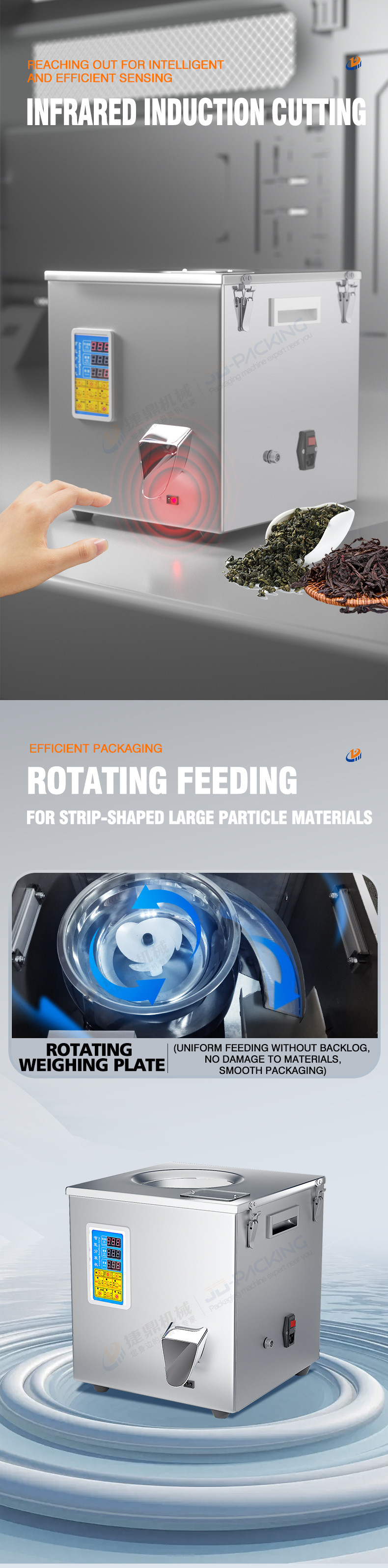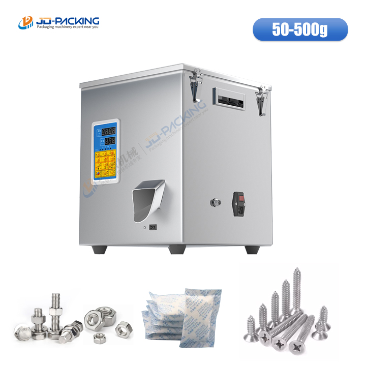The 500g rotary filling machine produced by JD is suitable for quantitative weighing and filling of dry products, hardware accessories, electronic components, screws and nuts, dates and longans, black tea and green tea, white tea and black tea, scented tea, long strip shape, block, irregular and other materials