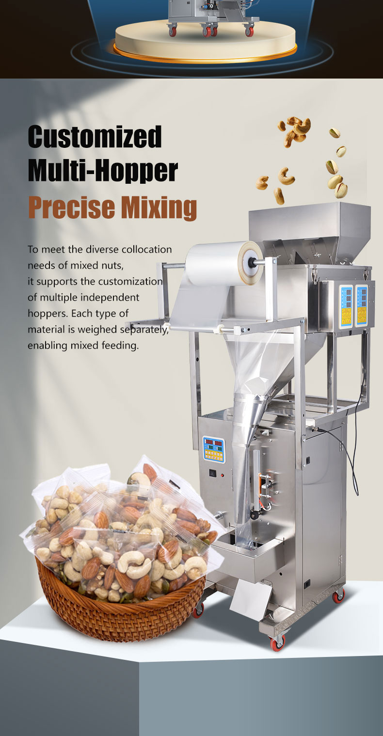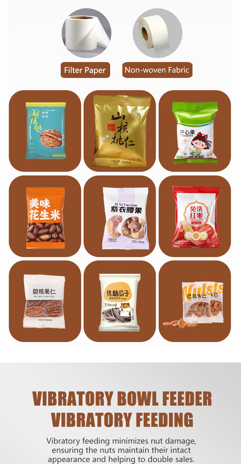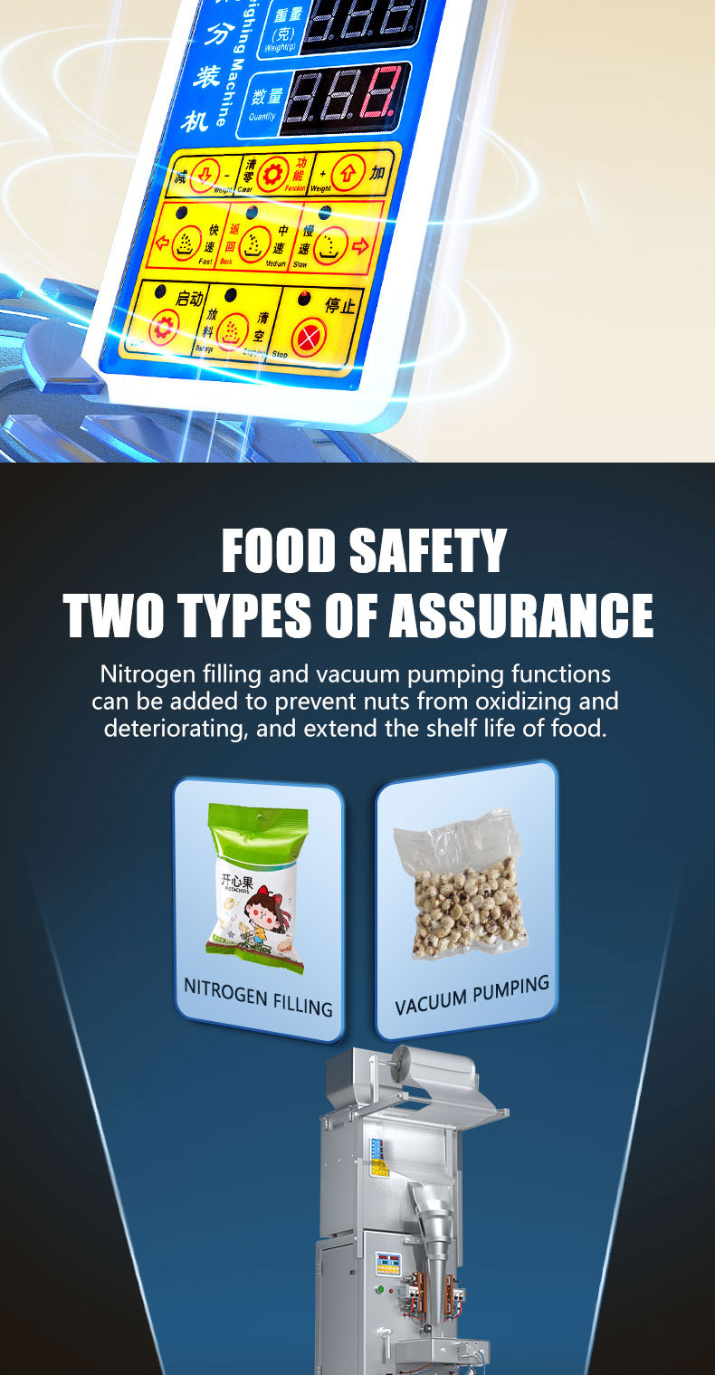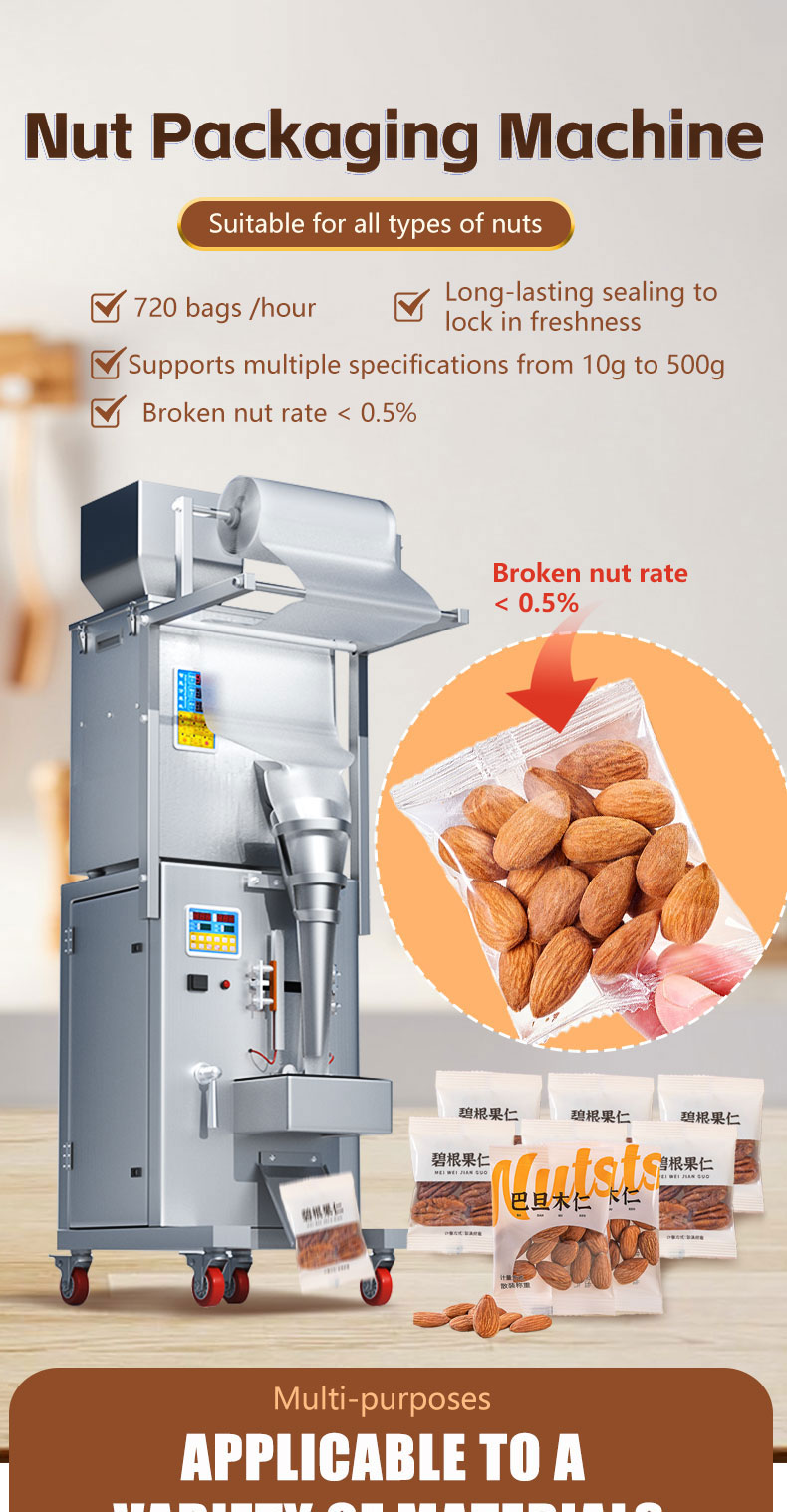 JD production of 500 grams of electric large packaging machine is suitable for Nut, Almond, Walnut, Peanut, Cashew, Pistachio material such as quantification, weighing, filling, sealing,The packaging machine can be equipped with additional vacuum pumping and nitrogen gas.