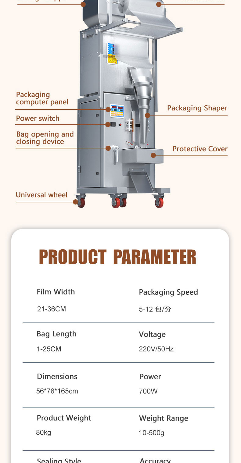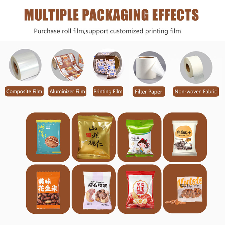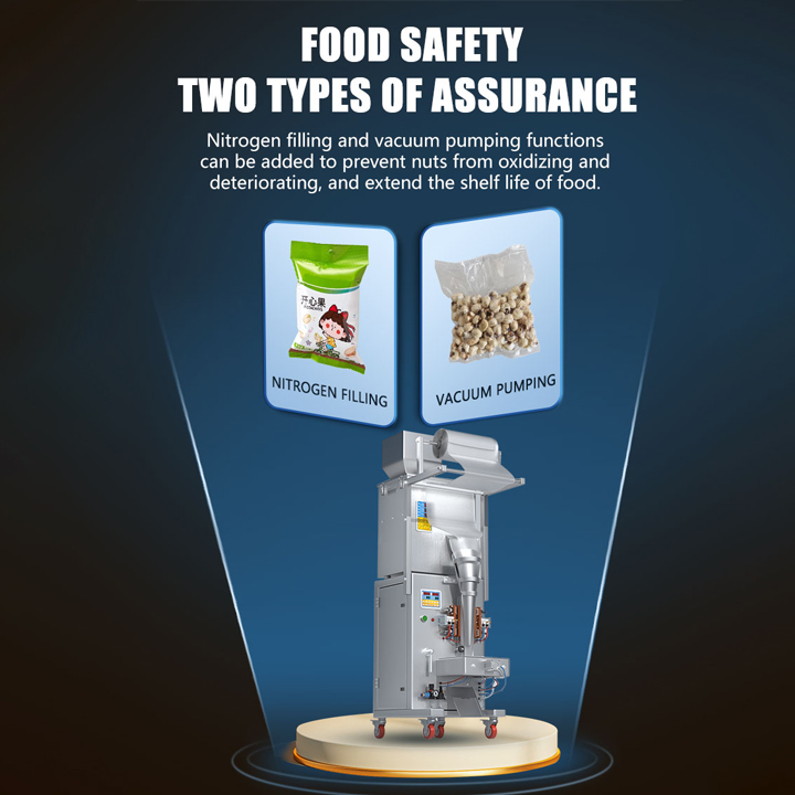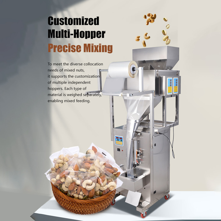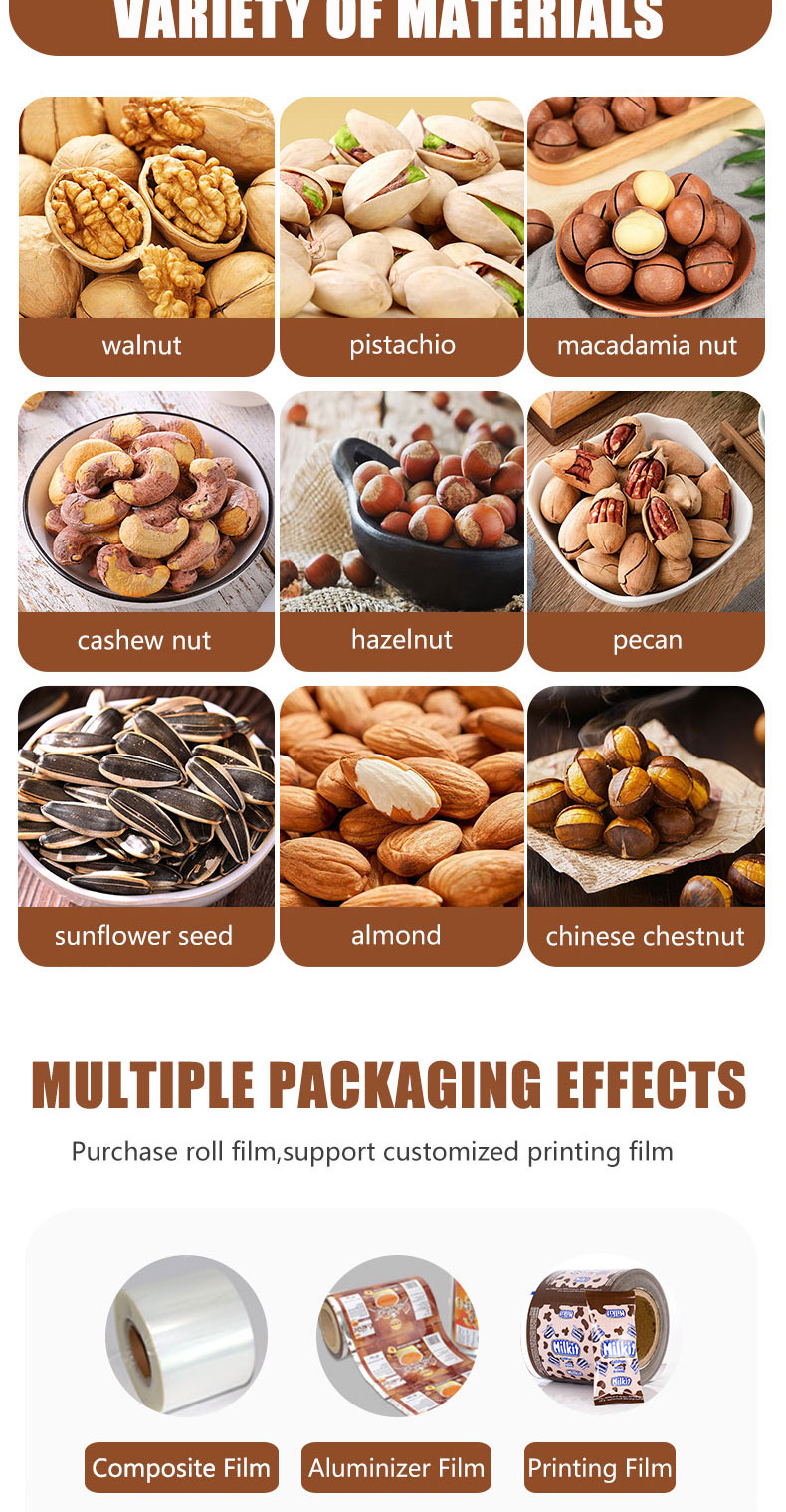 JD production of 500 grams of electric large packaging machine is suitable for Nut, Almond, Walnut, Peanut, Cashew, Pistachio material such as quantification, weighing, filling, sealing,The packaging machine can be equipped with additional vacuum pumping and nitrogen gas.