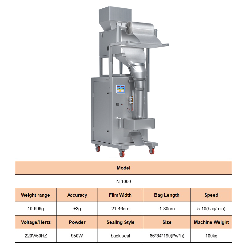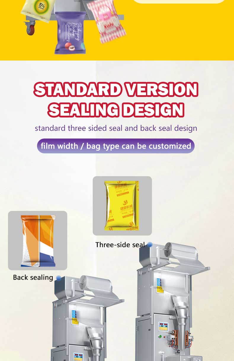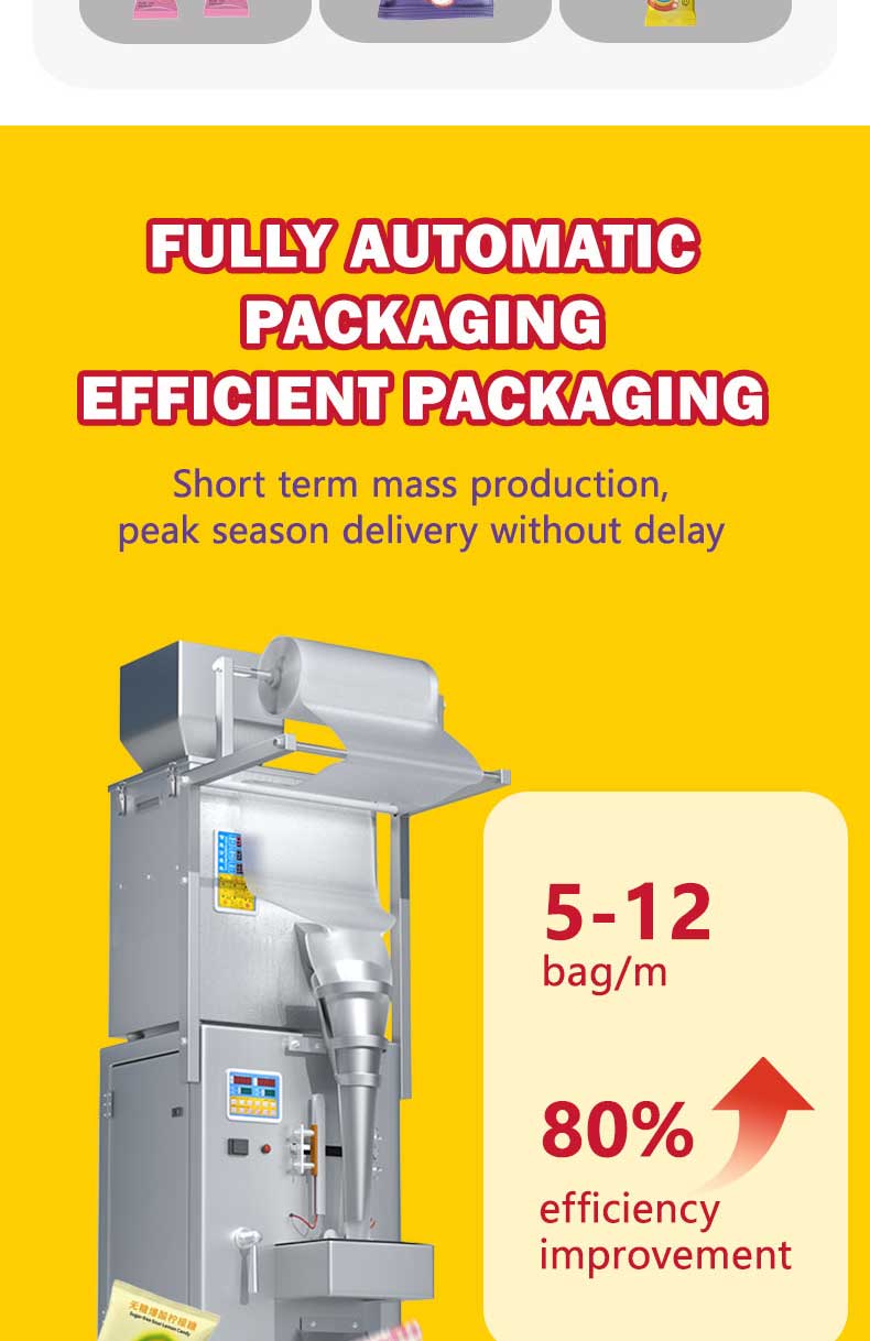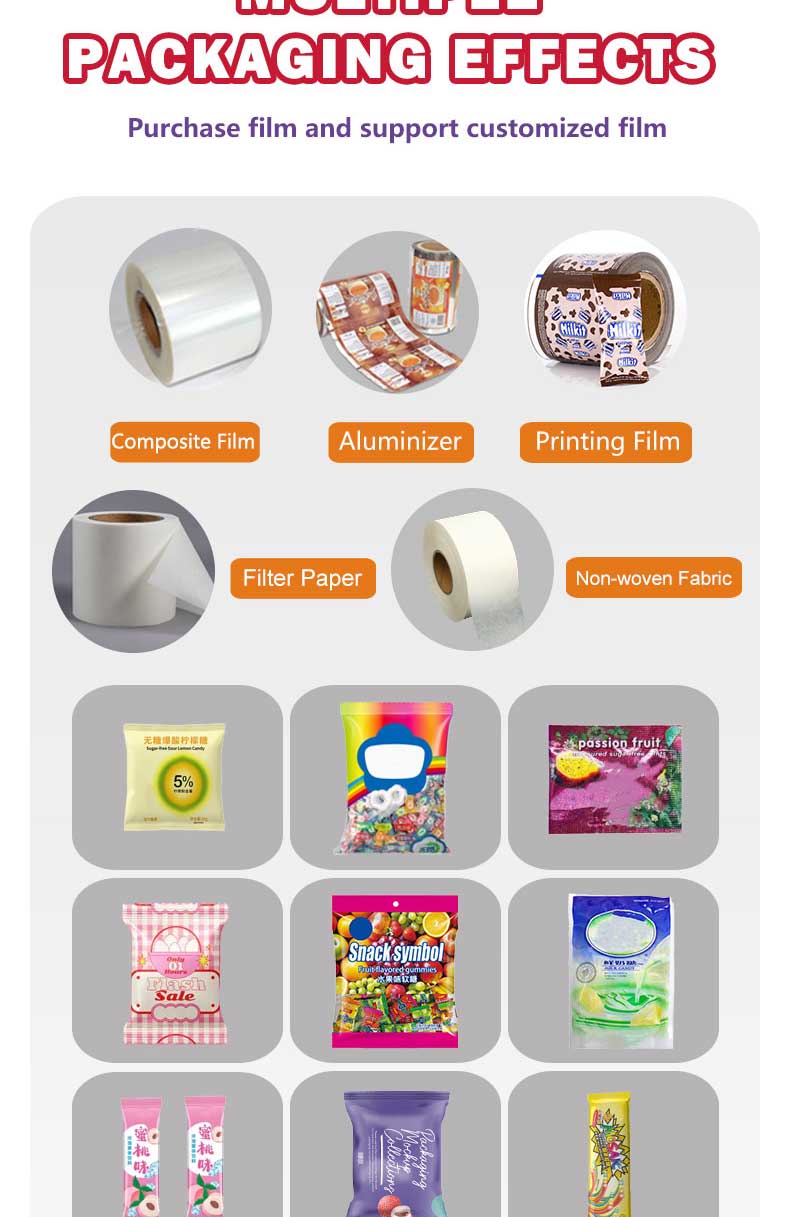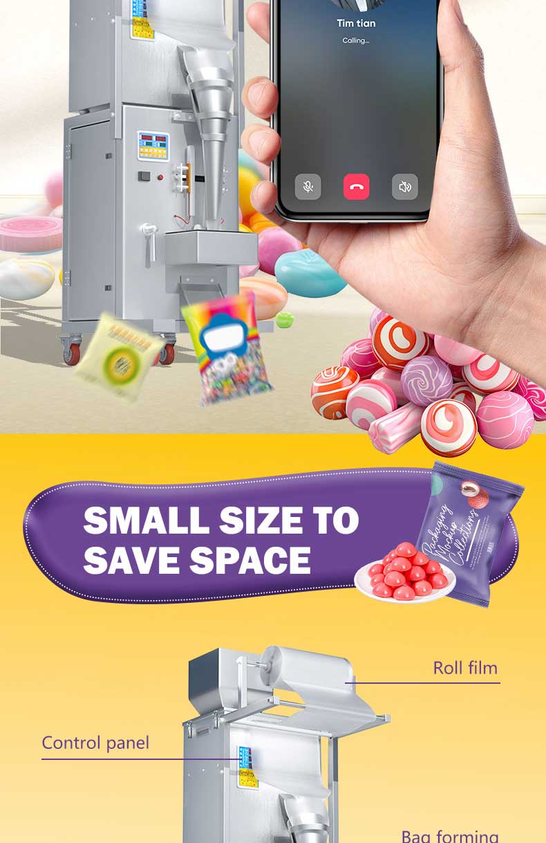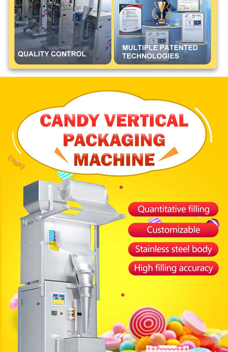 The 500g electric Candy packaging machine is suitable for weighing, filling, and sealing various types of candies such as gummies, hard candies, gummy candies, chocolate candies, etc