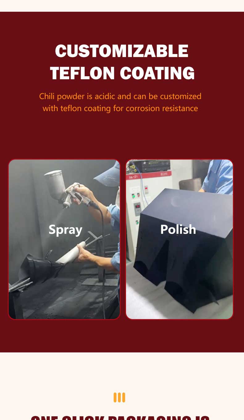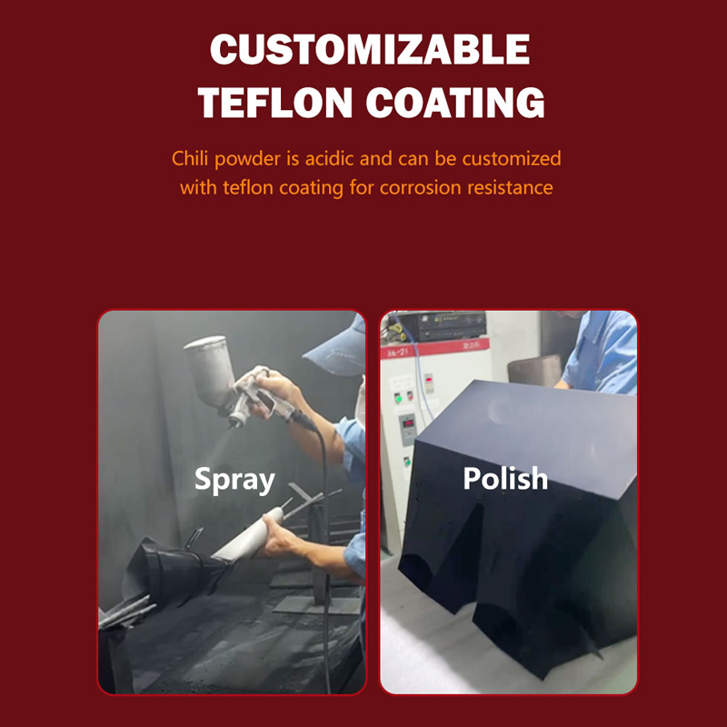 4. It is recommended to customize PTFE coating. Chili powder is an acidic product, and PTFE coating is not easy to corrode and prevent sticking