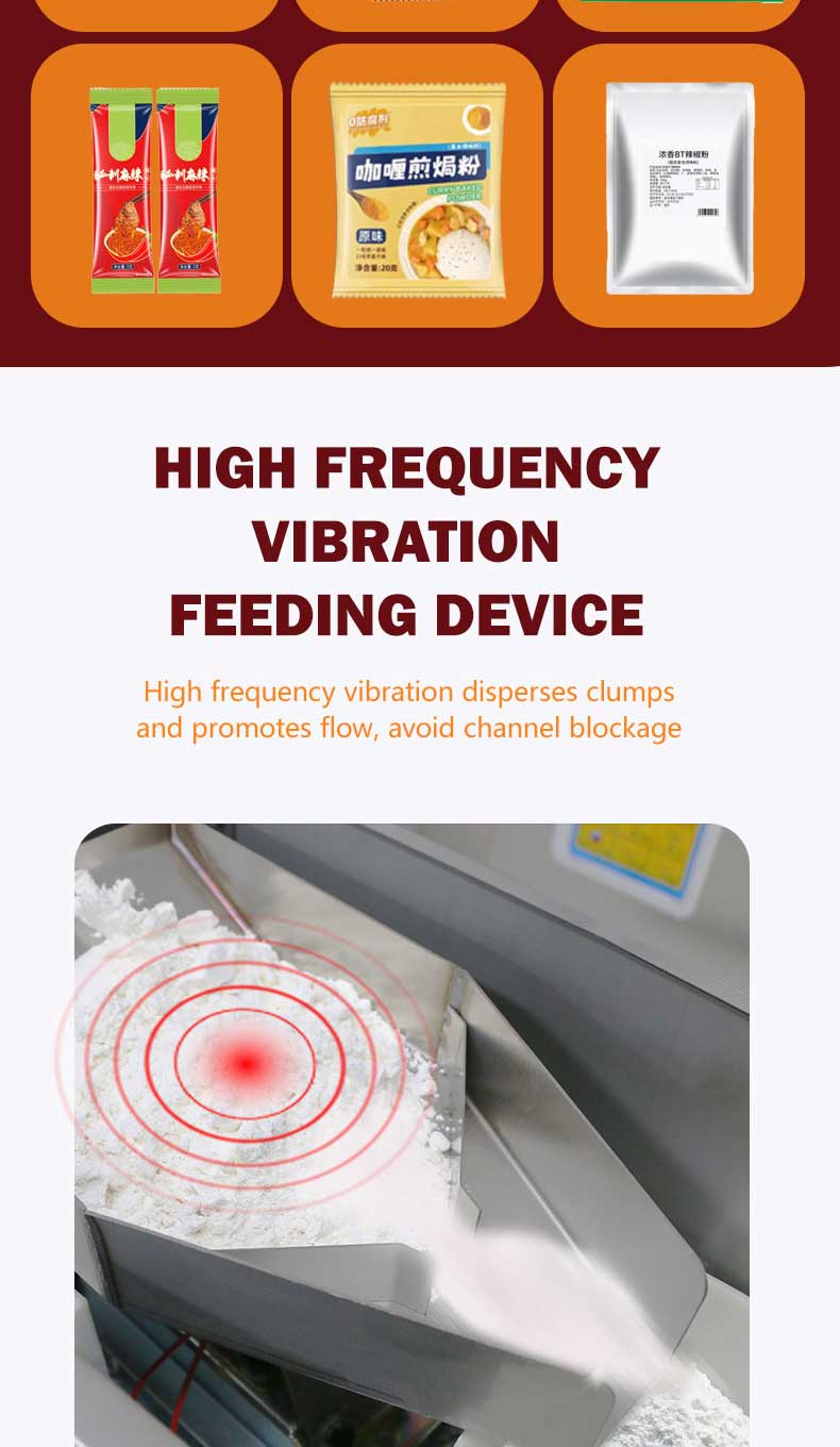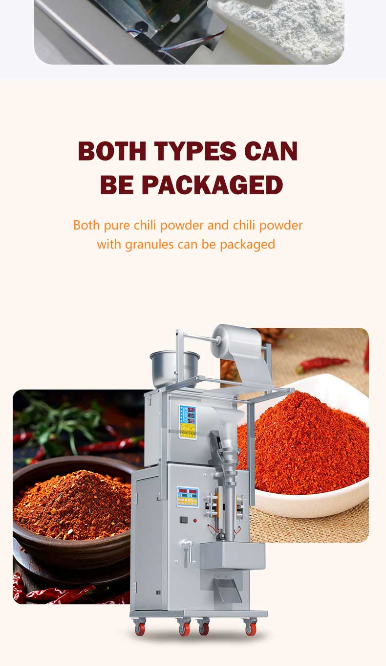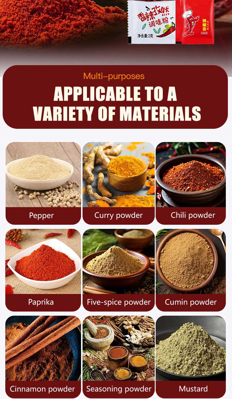 1-100g electric small packaging machine produced by Jieding is suitable for quantitative, weighing, filling, and sealing of various types of seasoning powders, such as Chili powder Paprika Powder Cumin Powder Garlic Powder Onion Powder Curry powder , etc