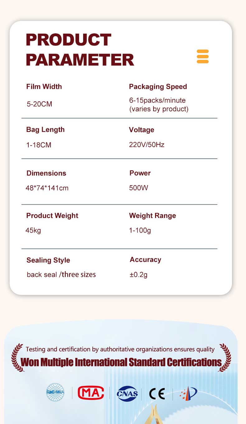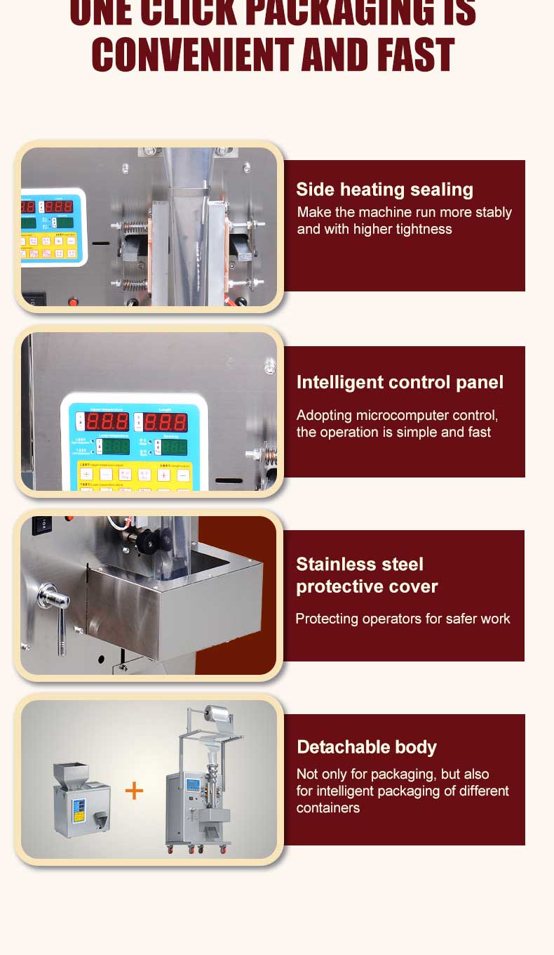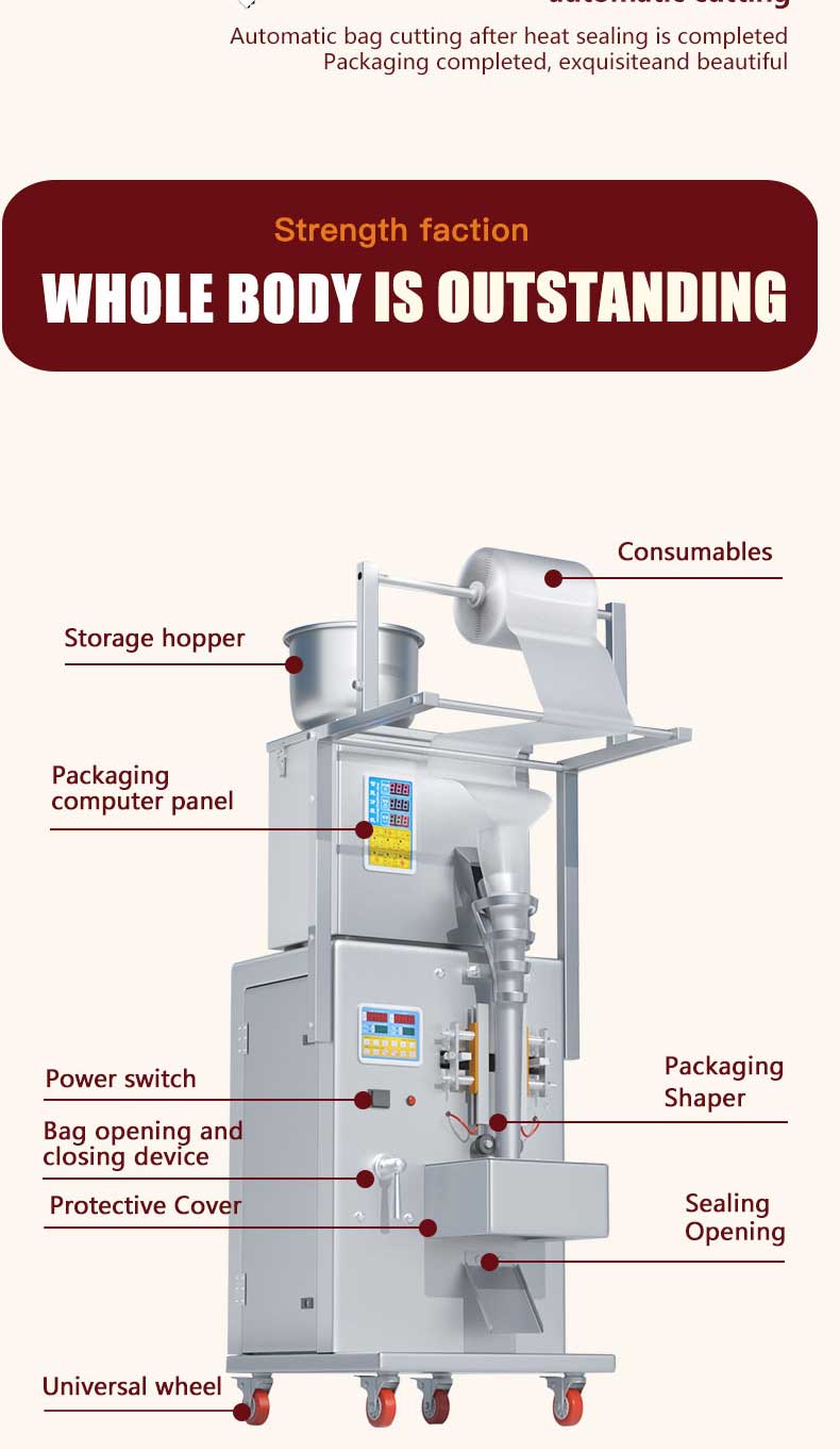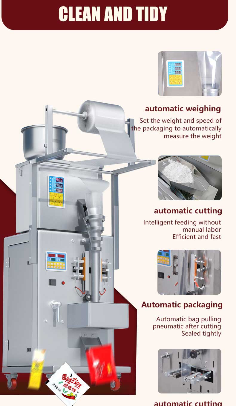 1-100g electric small packaging machine produced by Jieding is suitable for quantitative, weighing, filling, and sealing of various types of seasoning powders, such as Chili powder Paprika Powder Cumin Powder Garlic Powder Onion Powder Curry powder , etc