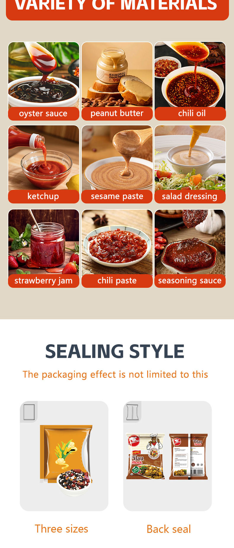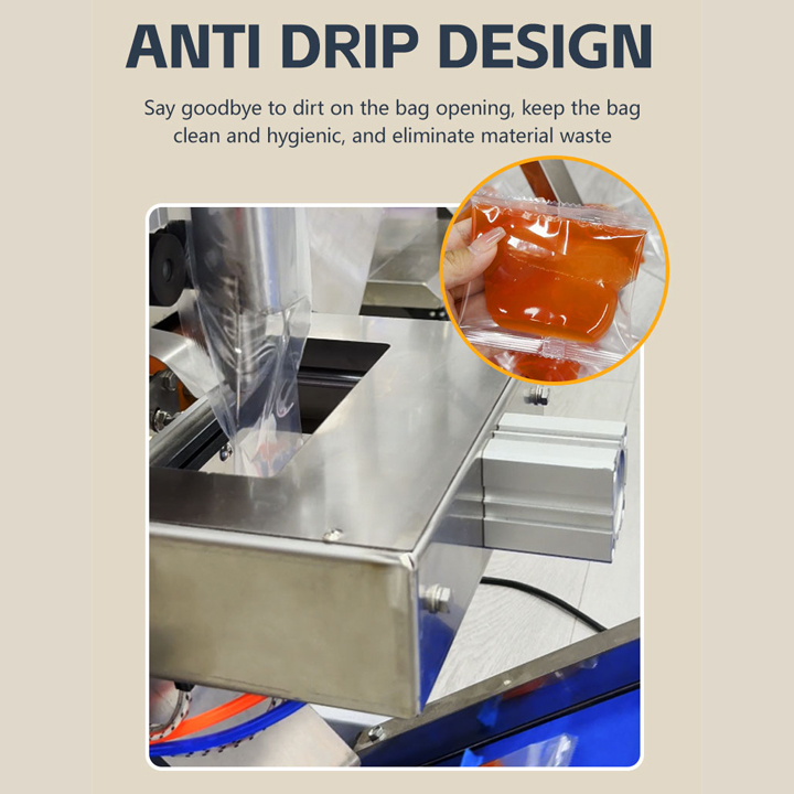 JIEDING tomato sauce packaging machine features a drip-proof design, with parts in contact with the sauce made of 304 food-grade stainless steel. It is equipped with a one-touch cleaning button for easy maintenance. Suitable for quantitative filling, bag making, and sealing of various sauce products such as jam, peanut butter, mayonnaise, barbecue sauce, and mustard.